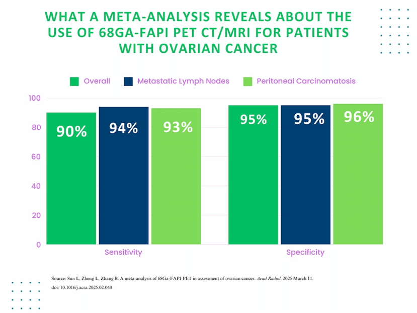 根據最近的一項統合分析,使用 Ga-68-FAPI PET 對卵巢癌偵測的整體敏感度(sensitivity)達到 90%。