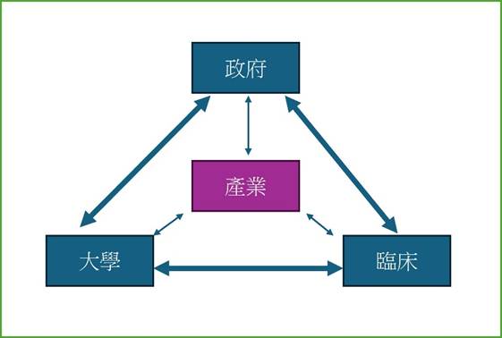 綜合上述分析,針對台灣核醫Theranostics發展模式進行初步探索,國內產學研三者關係並不如預期為”核醫黃金三角”模式(如下圖1)。黃金三角模式為由政府進行資源投入與策略布局,引導大學與研究單位進行創新研究與專利產出,繼而授權製藥產業進行深一層臨床前研究,將候選藥物朝向臨床試驗推進。