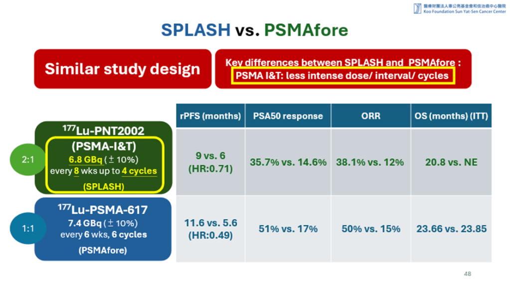 SPLASH 與PSMAfore是兩個設計相當類似的全球第三期臨床試驗,SPLASH的試驗藥物是PNT2002(Lu-177-PSMA-I&T),PSMAfore則是Pluvicto (Lu-177-PSMA-617),受試者皆為去勢療法抗性轉移性攝護腺癌(mCRPC),無化療經驗,先前接受過一種 ARPI(如 enzalutamide/abiraterone)藥物治療失敗的病人,隨機對照,與更換一種 ARPI藥物來比較療效。PSMAfore早一年在2023年搶先發表期中分析成果,確認試驗結果顯示與更換ARPI 相比,Lu-177-PSMA-617顯著改善rPFS (HR = 0.49)。SPLASH於2024年也發表了期中分析結果,同樣顯示與更換ARPI 相比,Lu-177-PSMA-I&T也顯著改善rPFS。然而雙試驗後期都遭遇交叉治療(crossover)的干擾,使 OS 資料難以支持顯著差異。不知是否因為試驗結果未超越PSMAfore,Lantheus 最終決定不遞交 PNT2002的NDA。這樣的結果也造成日後的放射靶向治療(radioligand therapy, RLT) 試驗設計避免 crossover,或設計延遲治療試驗模式(delayed crossover)以提升 OS 終點可解釋性。
